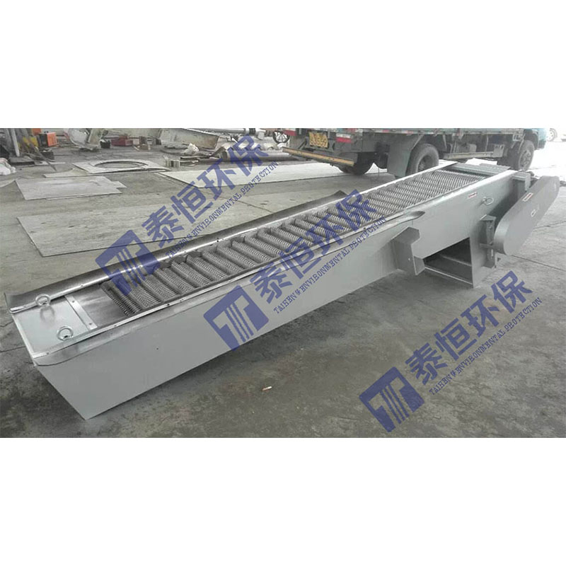 回轉(zhuǎn)式格柵除污機設(shè)備是由一種獨特的耙齒廠裝配成一組回轉(zhuǎn)格柵鏈。在電機減速器的驅(qū)動下,耙齒鏈進(jìn)行逆水流方向回轉(zhuǎn)運動。耙齒鏈運轉(zhuǎn)到設(shè)備的上部時,由于槽輪和彎軌的導(dǎo)向,使每組耙齒之間產(chǎn)生相對自清運動,絕大部分固體物質(zhì)靠重力落下。另一部分則依靠清掃器的反向運動把粘在耙齒上的雜物清掃干凈。按水流方向耙齒鏈類同于格柵,在耙齒鏈軸上裝配的耙齒間隙可以根據(jù)使用條件進(jìn)行選擇。當(dāng)耙齒把流體中的固態(tài)懸浮物分離后可以保持水流暢通流過。整個工作過程是連續(xù)的,也可以是間歇的。
